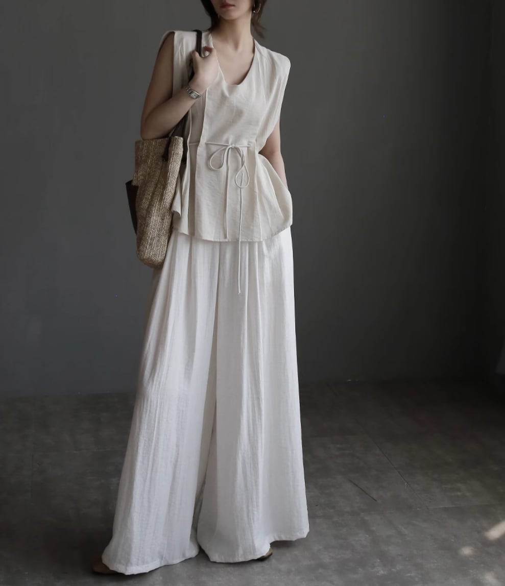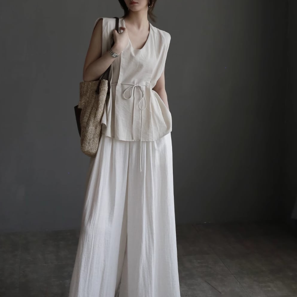 【2点セット】2色/ノースリーブウエストマークトップス+ワイドレッグパンツ ・18707