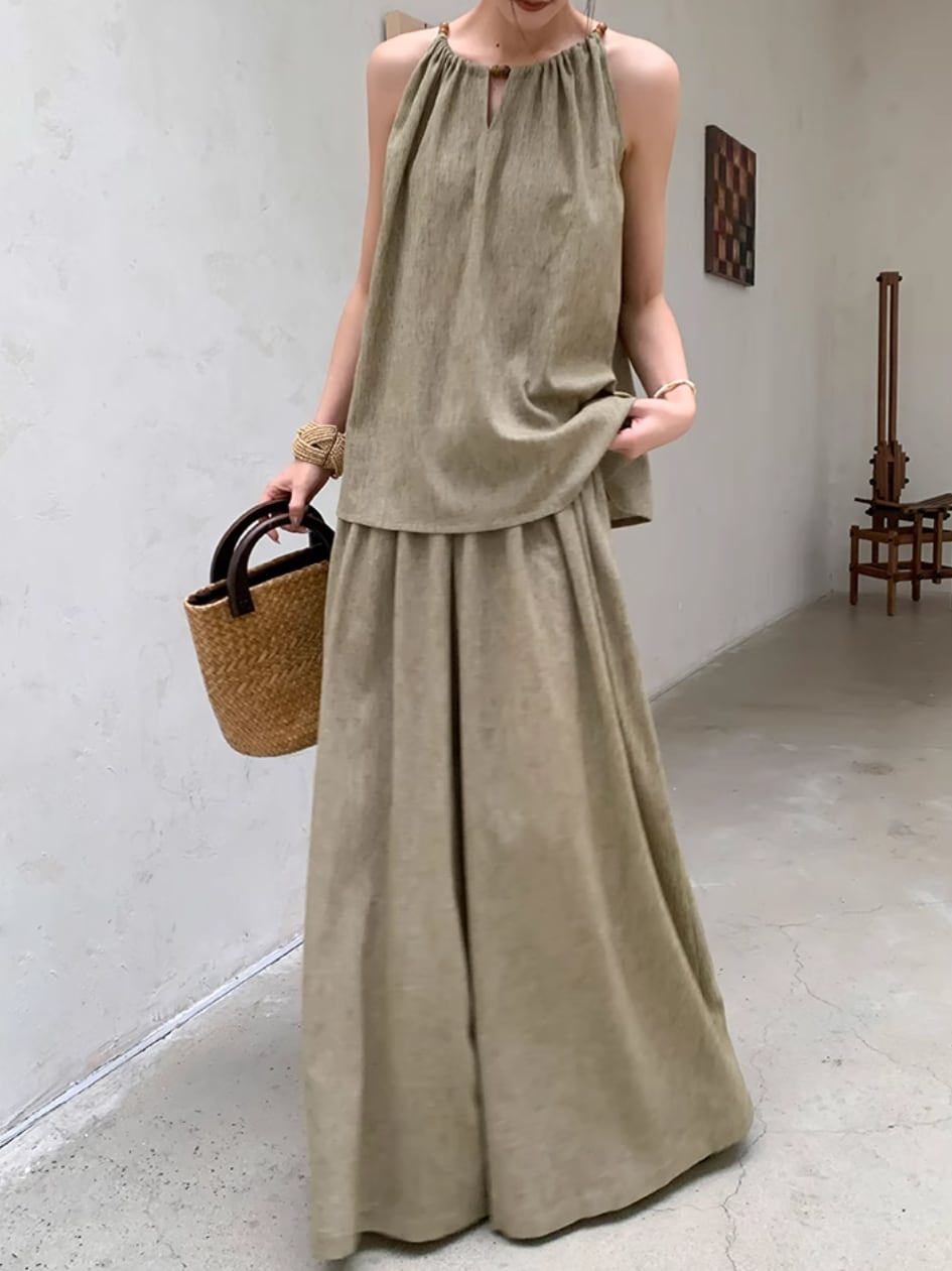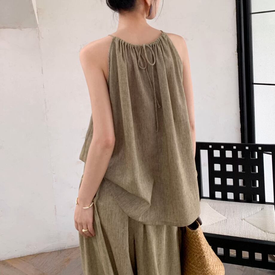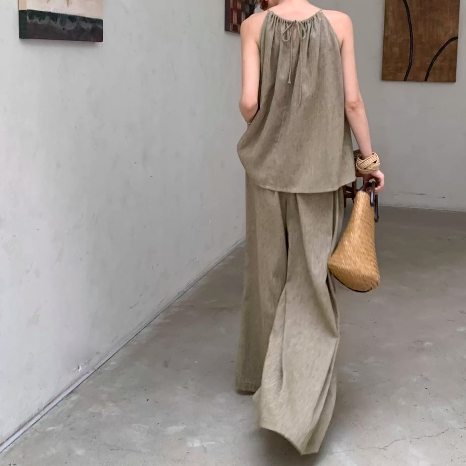 【2点セット】2色/ノースリーブウエストマークトップス+ワイドレッグパンツ ・18707