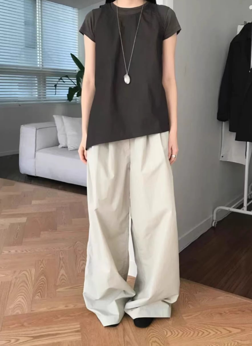 【2点セット】2色/ノースリーブウエストマークトップス+ワイドレッグパンツ ・18707