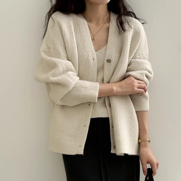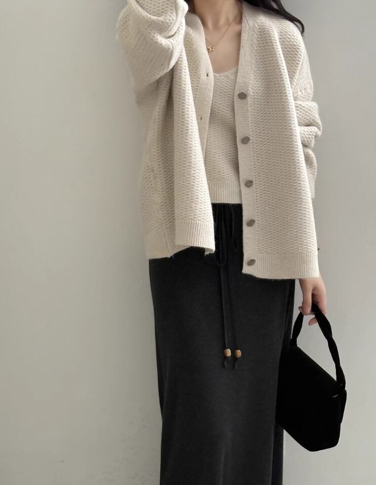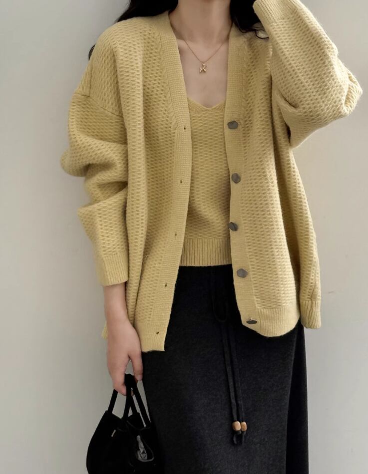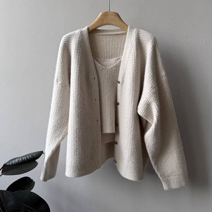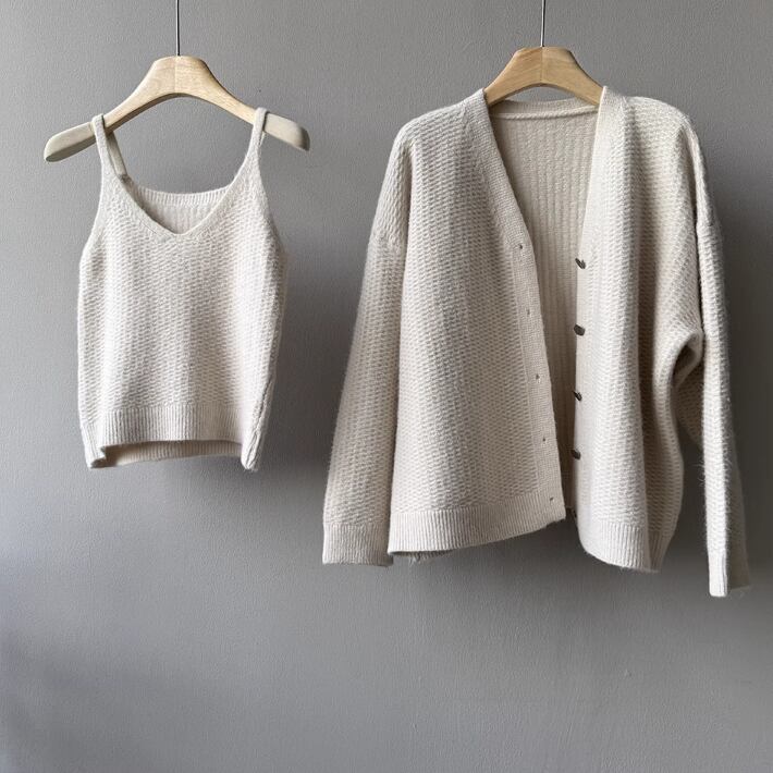 ▽Instagram「新作情報配信中」 フォローお願いいたします。 https://www.instagram.com/stir.clothes/ ▼カラー オフホワイト(画像2枚目) イエロー(画像3枚目) グレー(画像4枚目) ▼サイズ [ フリーサイズ ] カーディガン:着丈59cm バスト120cm 肩幅59cm 袖丈45cm 裾囲り120cm キャミソール:着丈46cm バスト68cm 裾囲り72cm ※1-3cm程度の誤差がある場合がございます。予めご了承ください。 ▼素材 アクリル、ナイロン、ポリエステル ▼シーズン 秋,冬 ▼同じカテゴリの商品はこちら https://www.stir.jp/categories/3047418 ▽お支払い方法 ・クレジットカード決済 ・キャリア決済 (docomo/au/Softbank/Y!mobile) ・後払い決済 (商品お届け後コンビニ払いなど) ▽注意点 ※こちらの商品は決済から10日-3週間前後でのお届けとなります。 ※配送日時指定等に関しては、ご指定できないことご了承くださいませ。 ※できる限り早くお届けできるように手配させて頂きます。 ※検品はしておりますが、もし届いた商品に不備がありましたら、誠実に対応させていただきます。 商品ID:ST019817