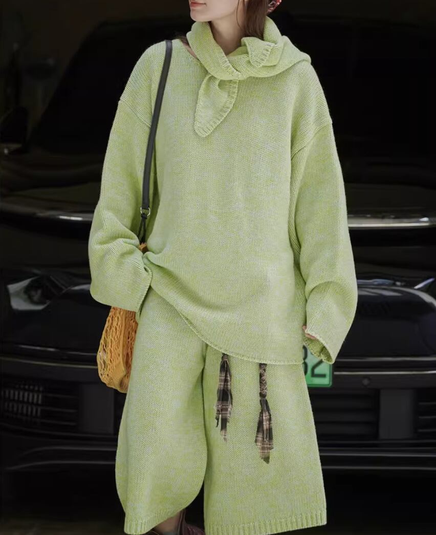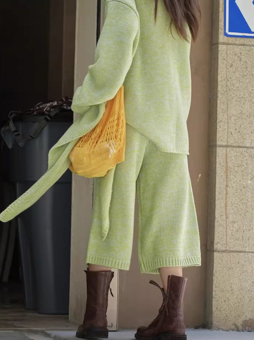 【2点セット】2色/ラウンドネックニットトップス+ワイドレッグパンツ ・20111